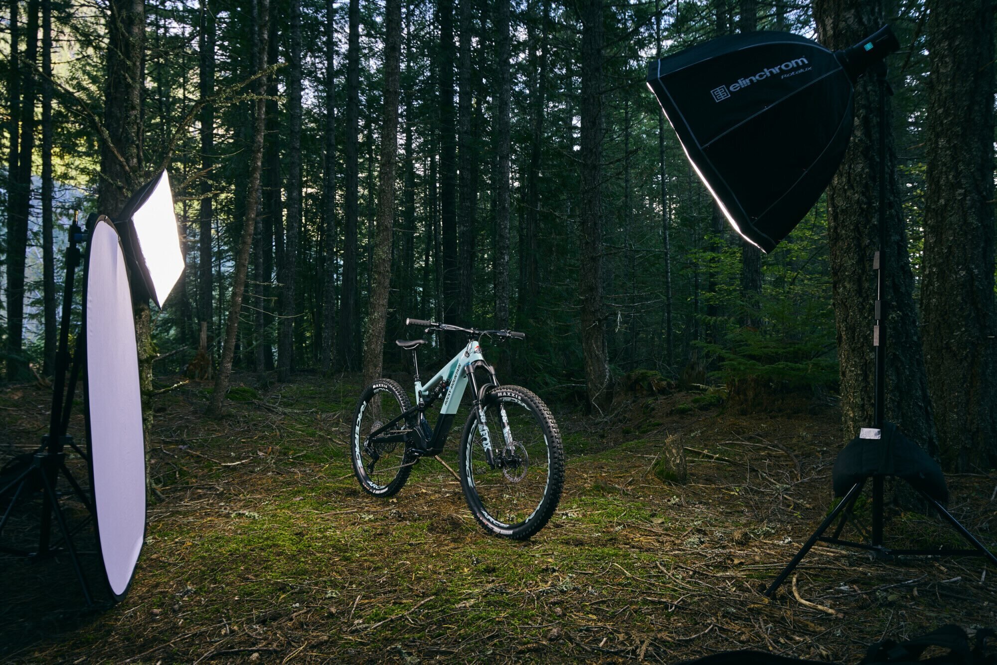 Lighting in the forest can be tricky, especially when it is sunny. The tree canopy filters the light and gives you a mix of contrasty bright highlights and dark shadows. As the sun gets higher in the sky this can sometimes cause unwanted hot spots. This wasn’t an issue for the first hero shot as there was still a mountain blocking the direct sunshine view. However, as the day went on this became a problem, so I set up two large black oval reflectors to block the sun and create shadow on the bike. This then allowed me to control all the light that was hitting the bike.